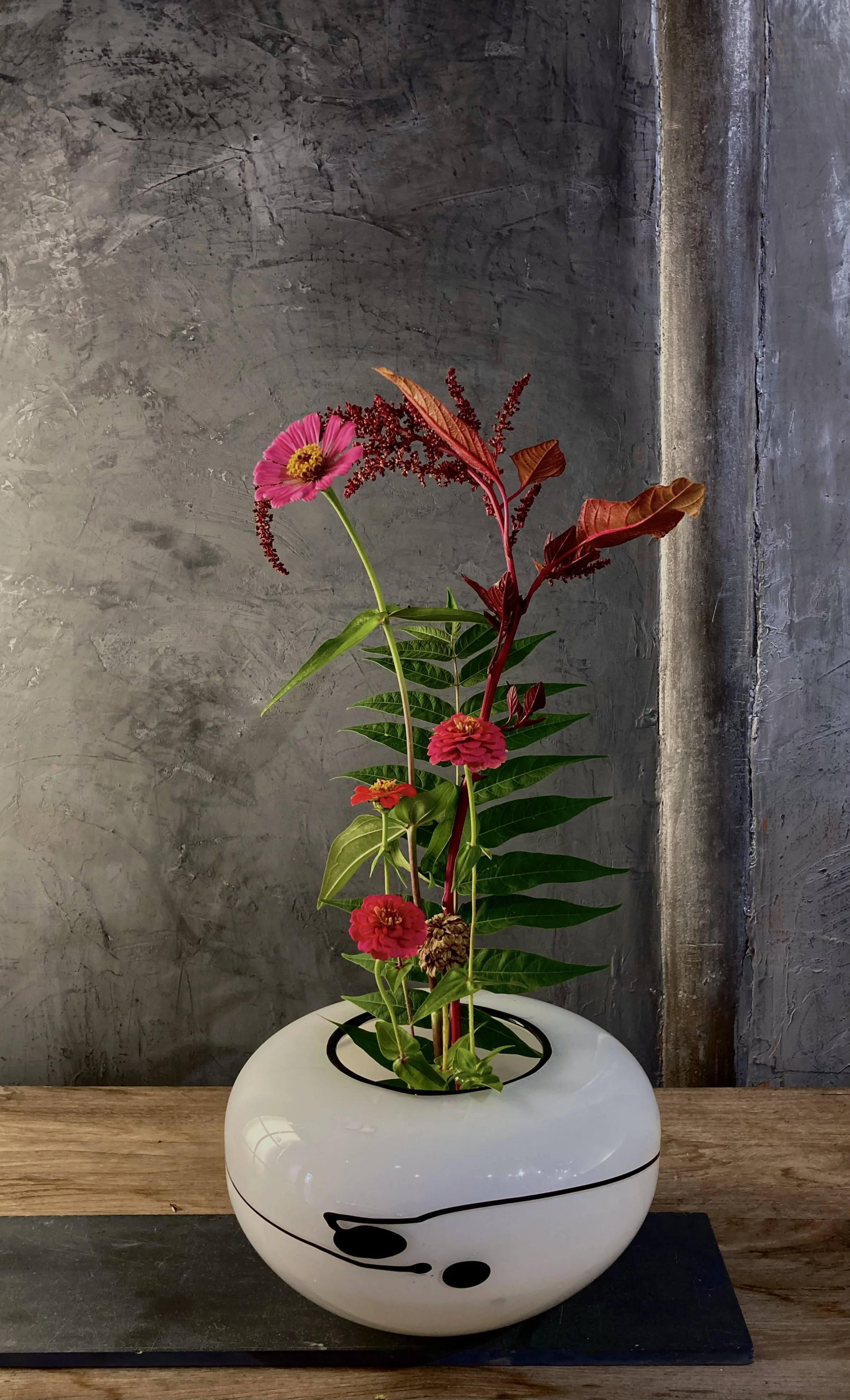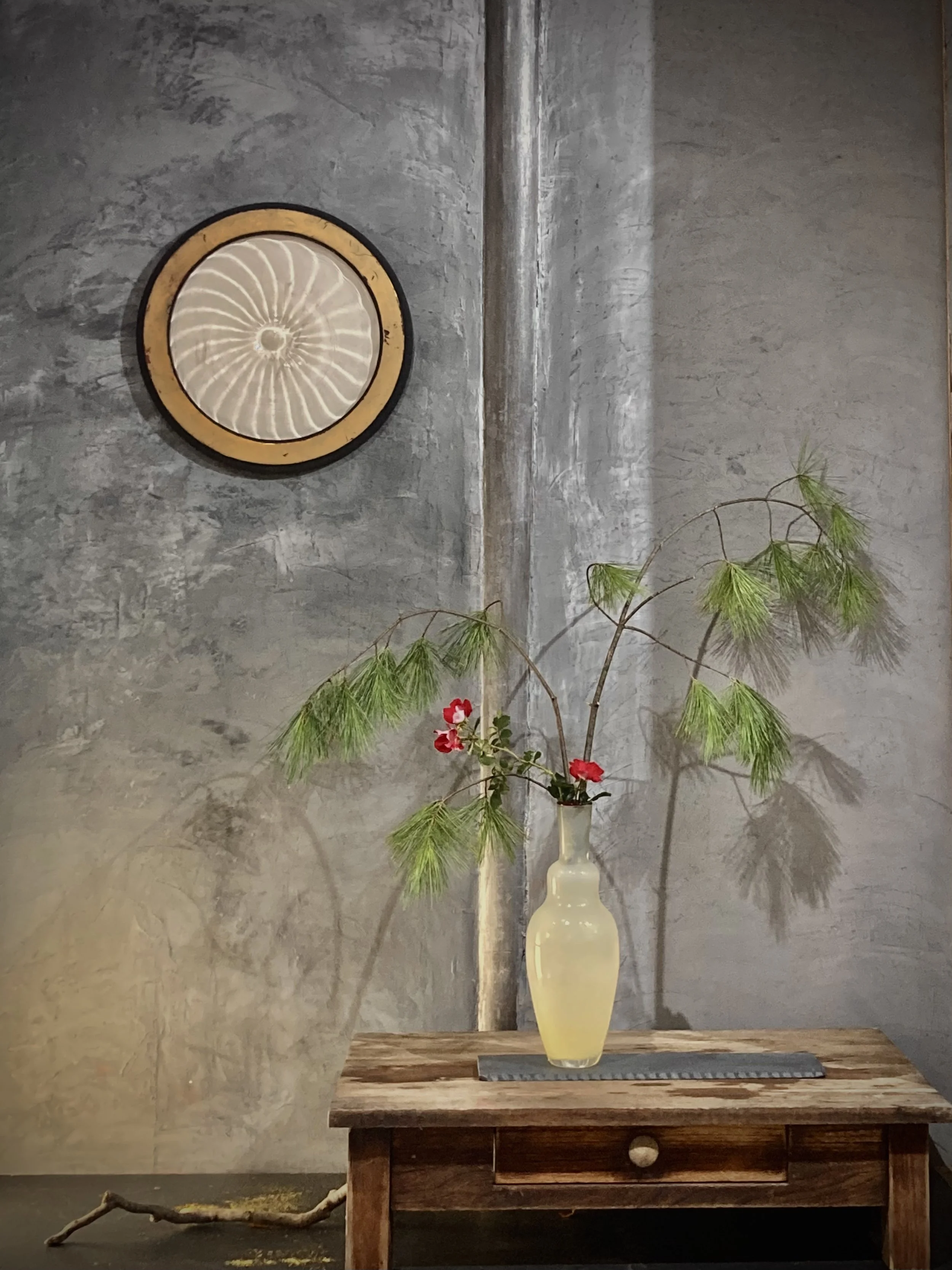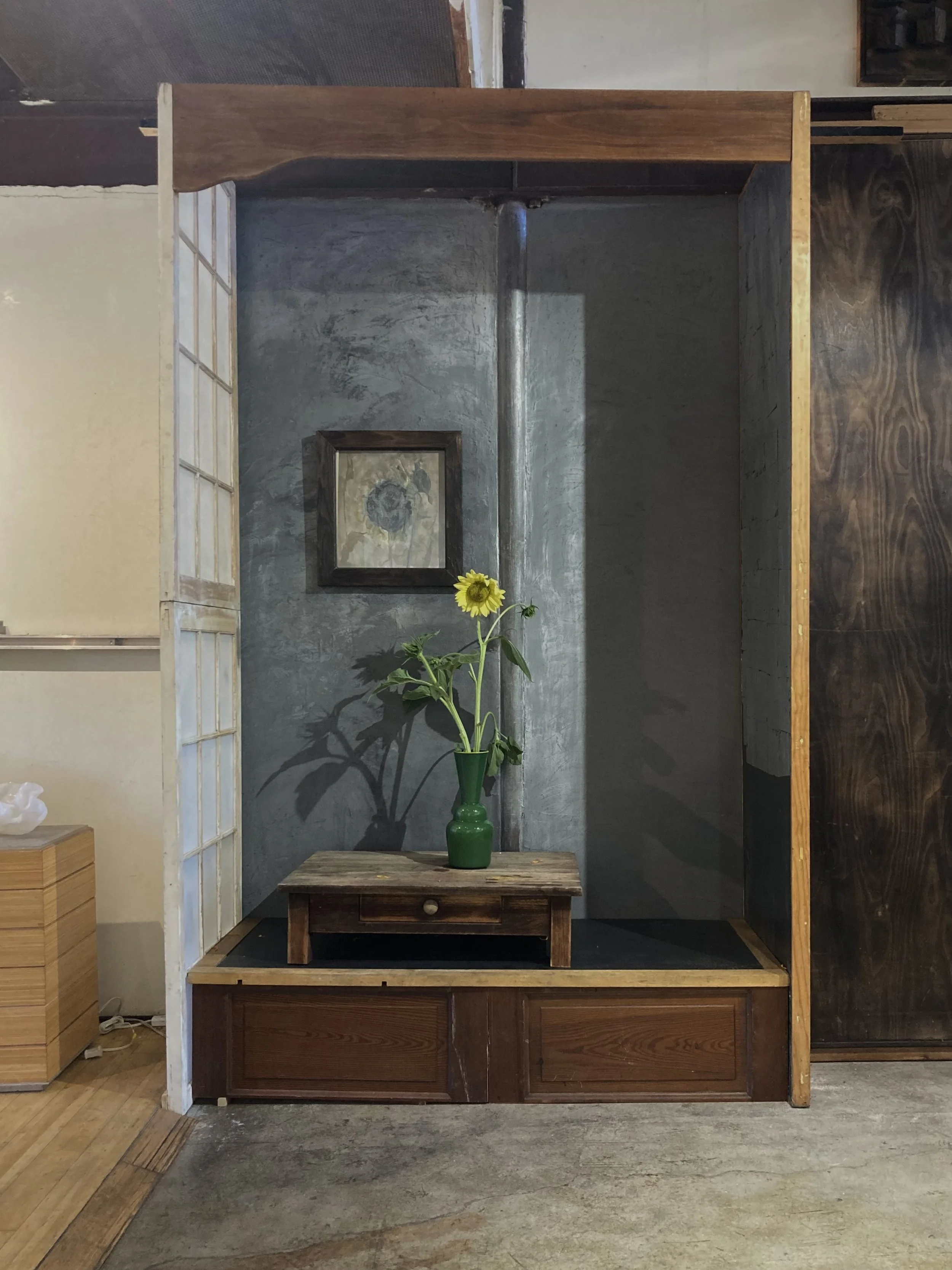 This week I put together an alcove in the showroom modeled after the tokonoma found in traditional Japanese tea houses. This was scared space set aside for a flower arrangement and picture or calligraphy scroll. My intent in creating this in my showroom is to have a space to practice arranging things , thinking about the relationships of flowers, vase and wall hanging . I have many more thoughts to share about this in upcoming posts….
