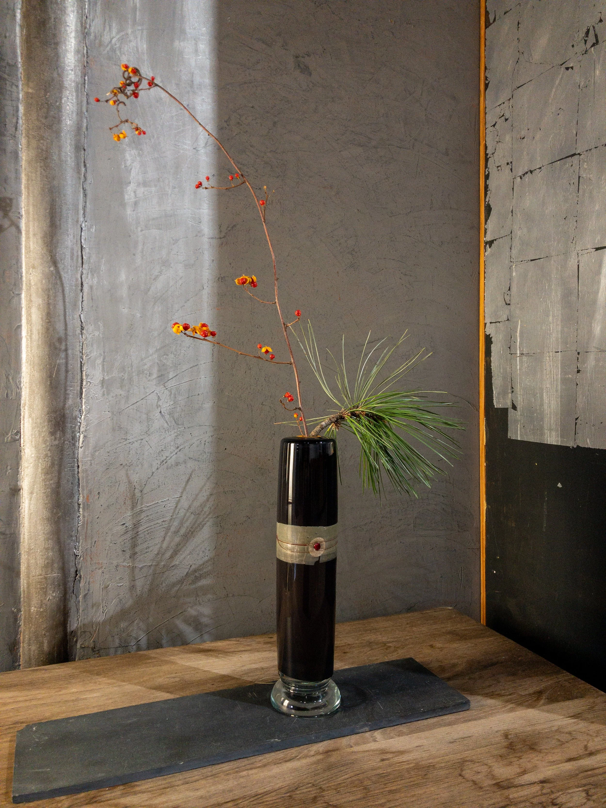 Summer ikebana ; white pine with roses in paladin vase