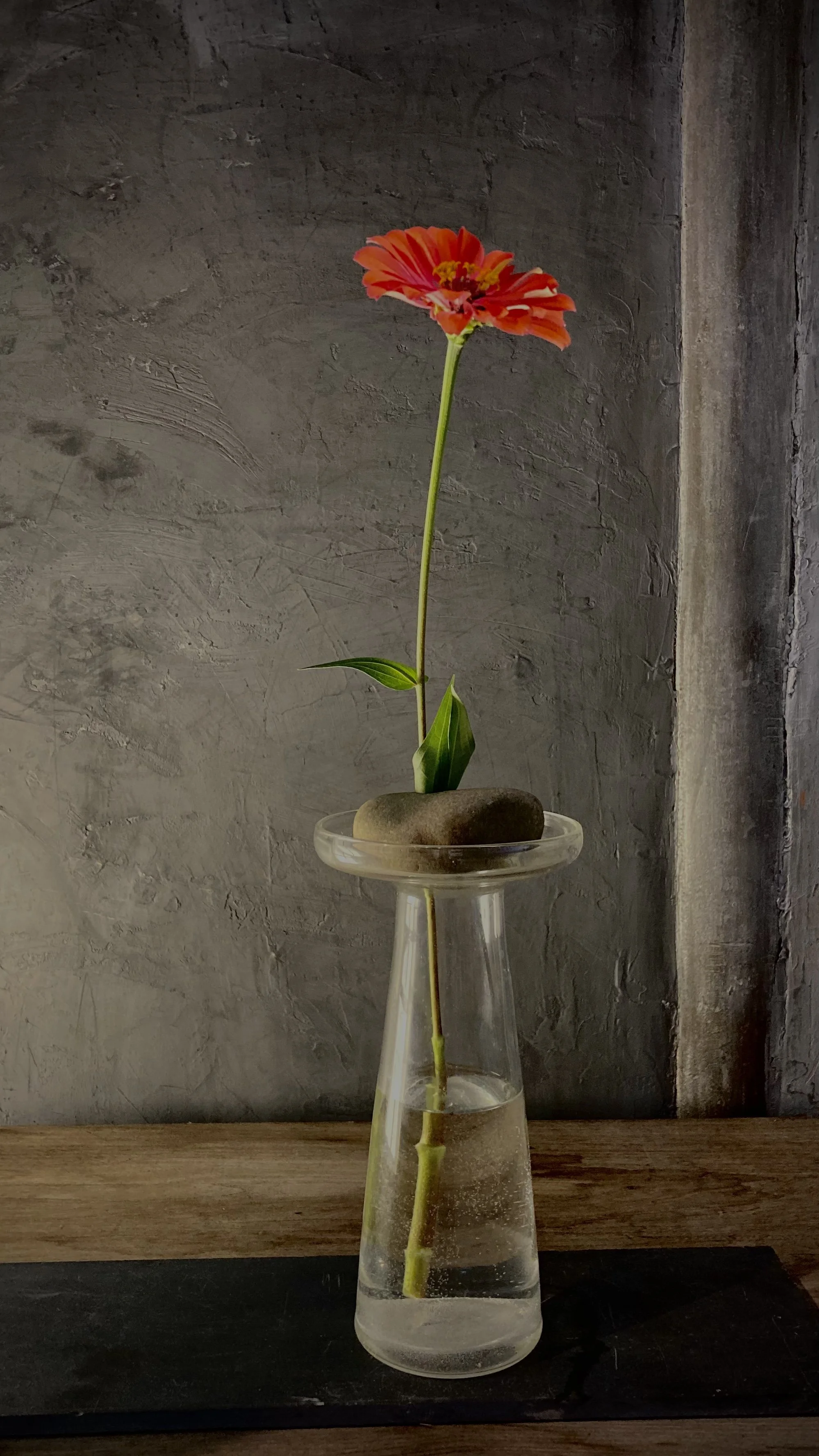 Zinnia with stone support in “requiem” clear vase