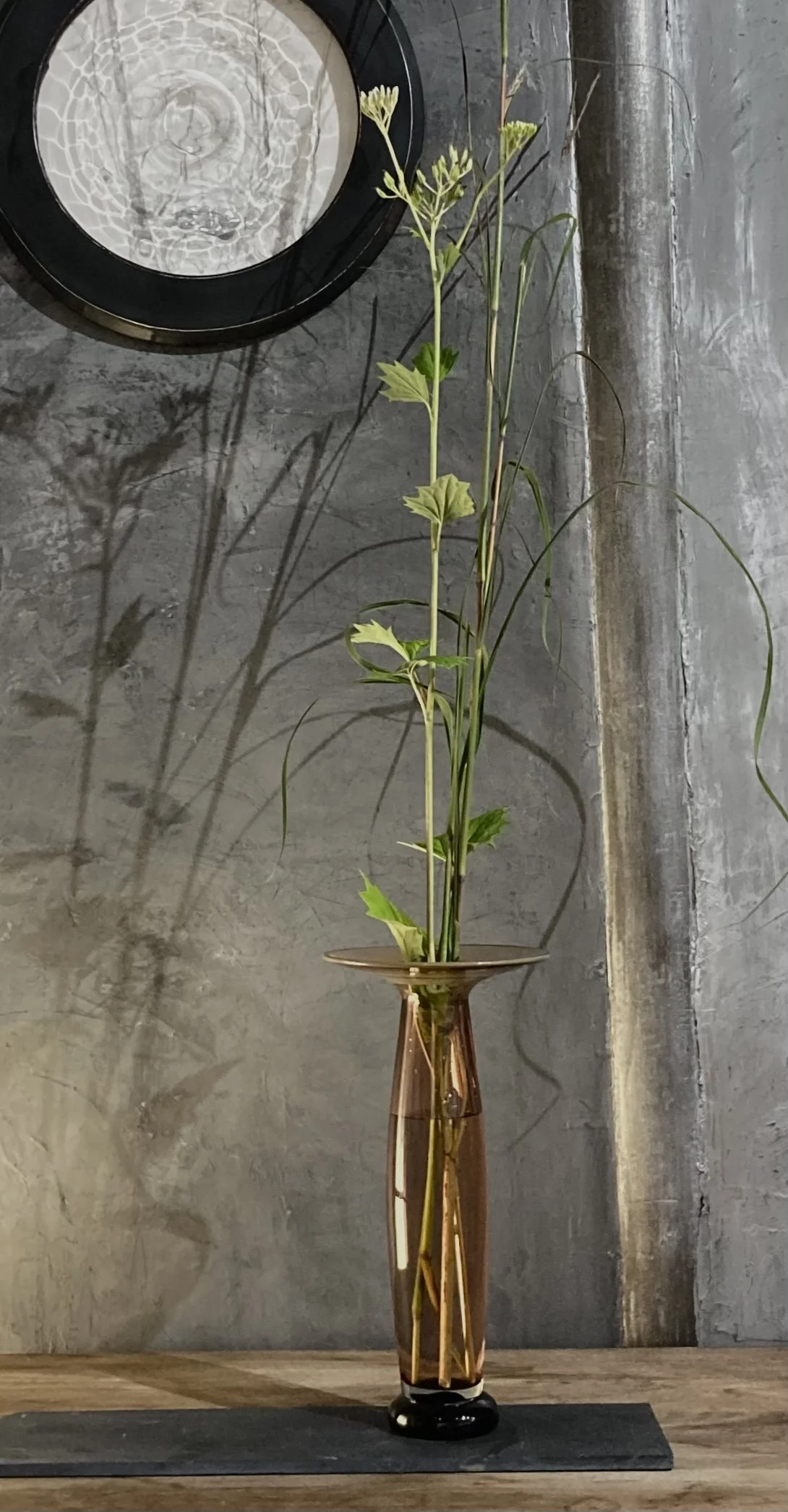 22:V!!:22 On wall: “Bombus” engraved glass over watercolor/ vase: paladin vase large #18 in forest green with sunflowers